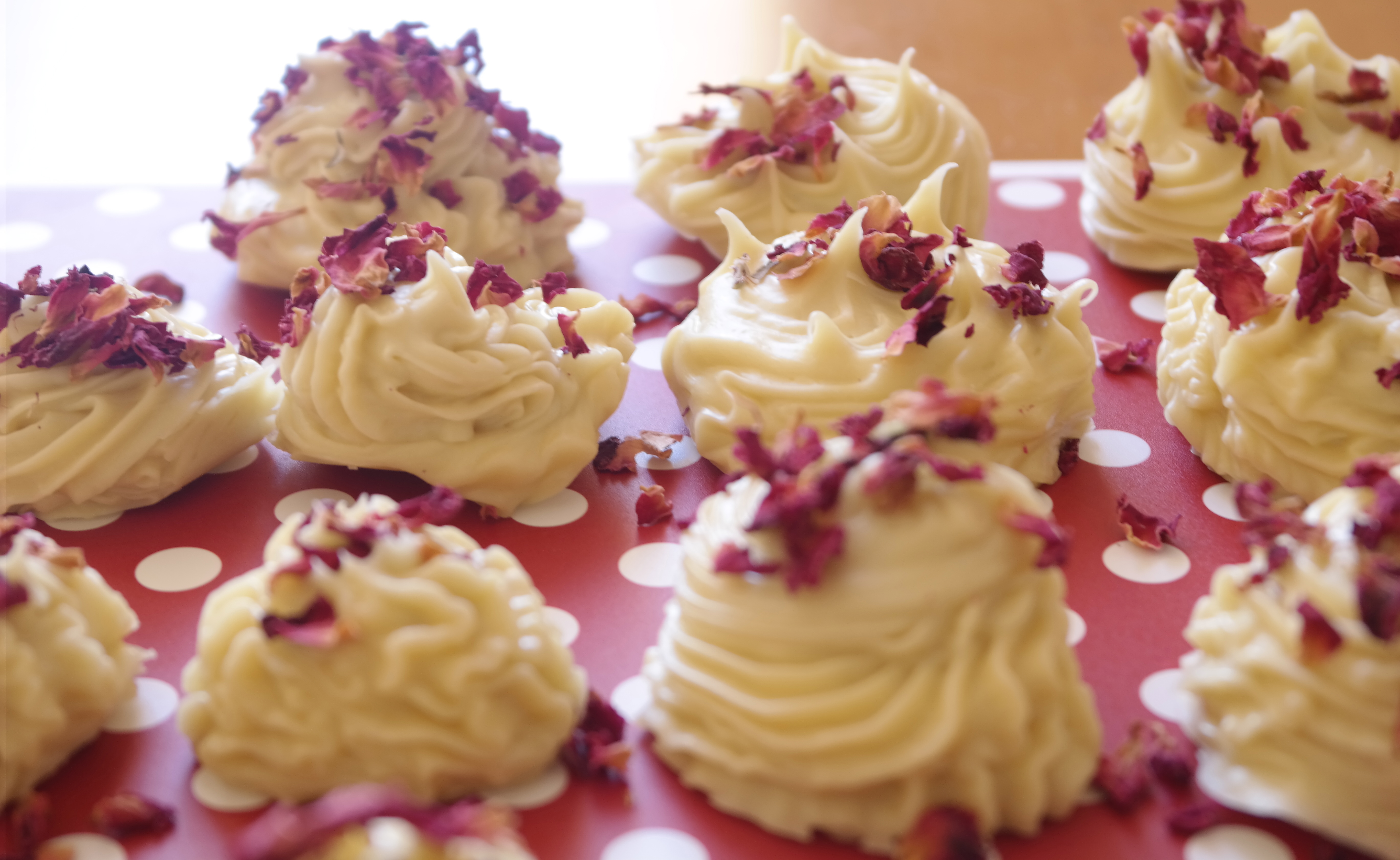 - When it’s all done,sprinkle your red rose petals on it and put in the freezer.