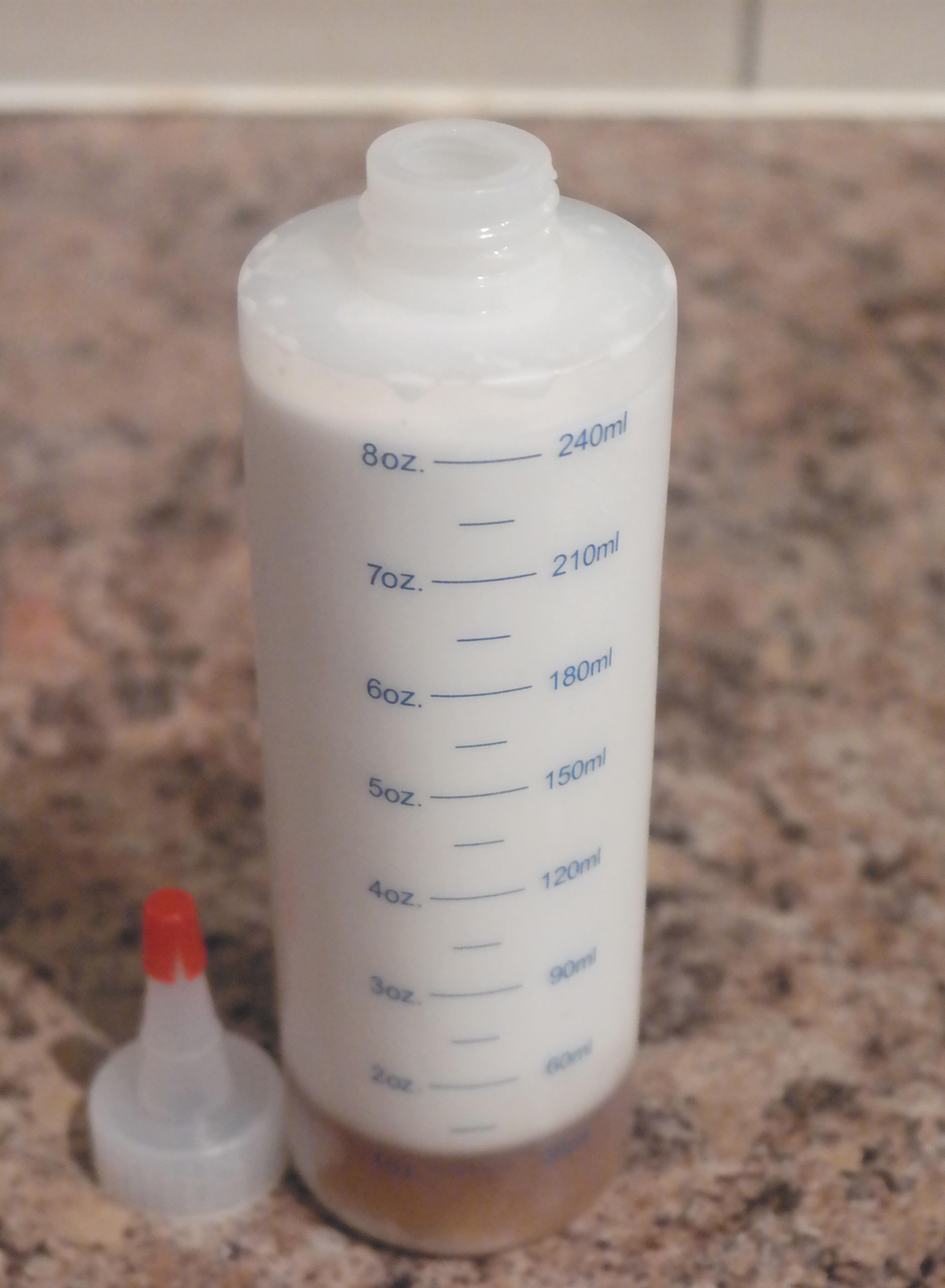 I use the measurement on the applicator bottle and I pour each ingredient in and shake the bottle to mix it all together. It can be very messy so applicator bottle comes in very handy.