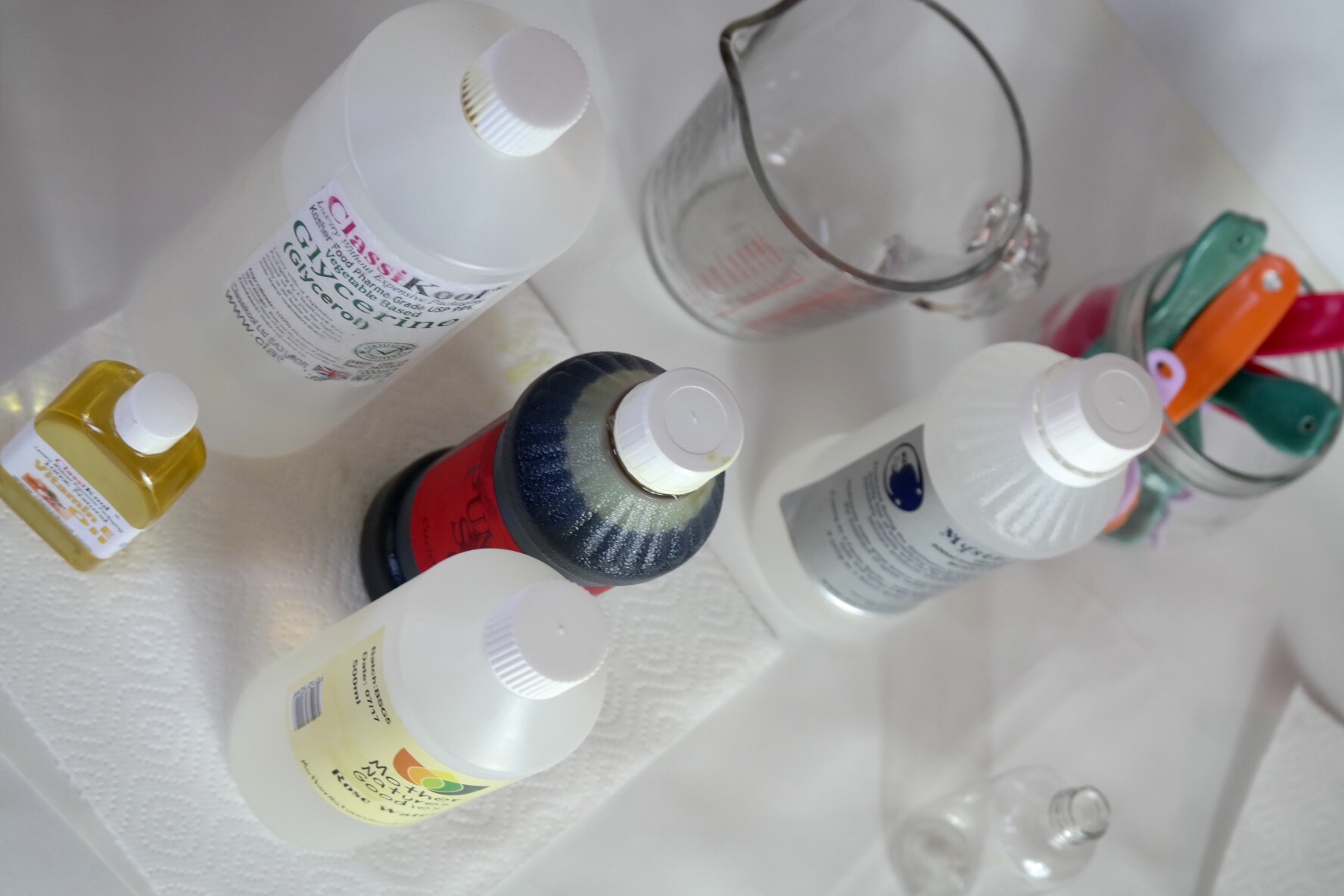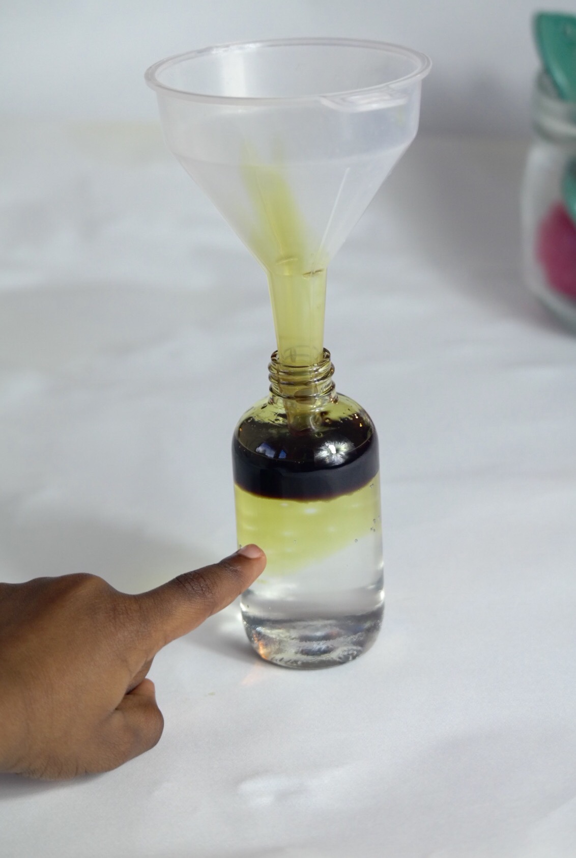 Add the hydrosol water to your bottle using your funnel to avoid waste. Measure your glycerine and pour it into the water, then add the vitamin E and oil of choice.
