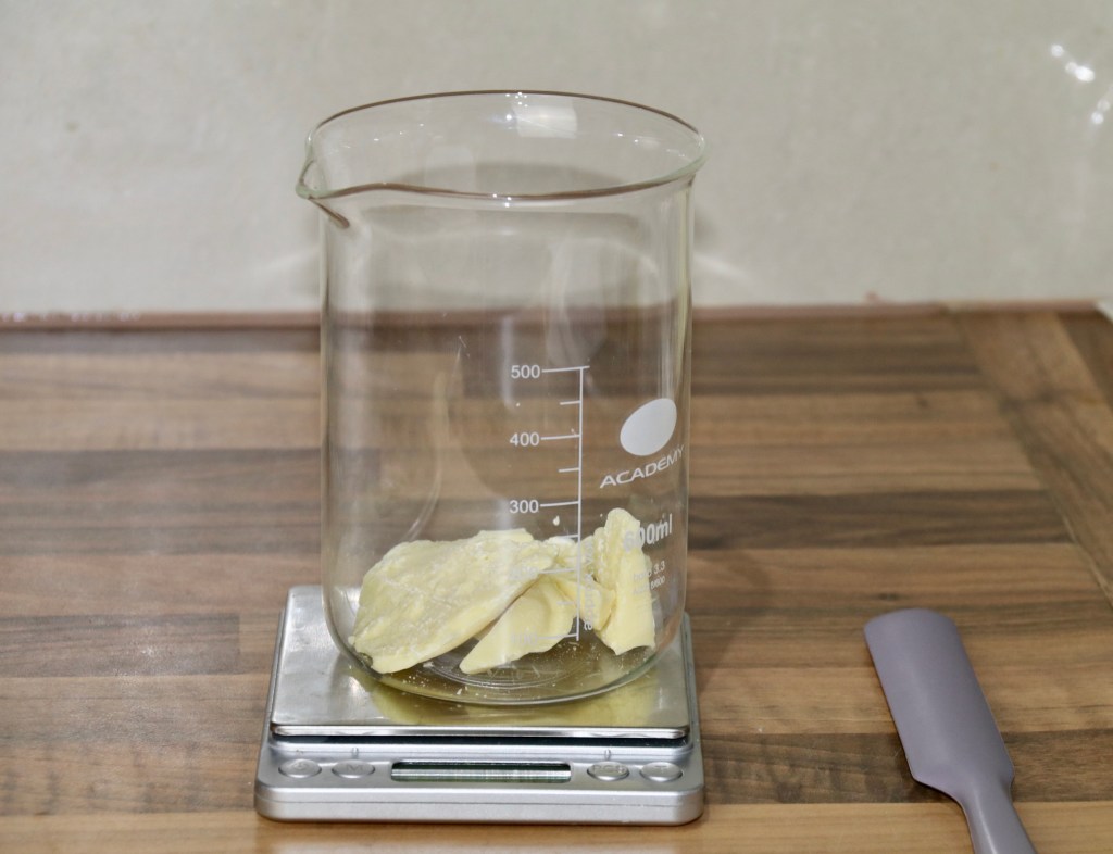 - Measure out the cocoa butter and the wax in a heat resistant bowl. Allow to melt in a microwave or double boiler/hot water bath.