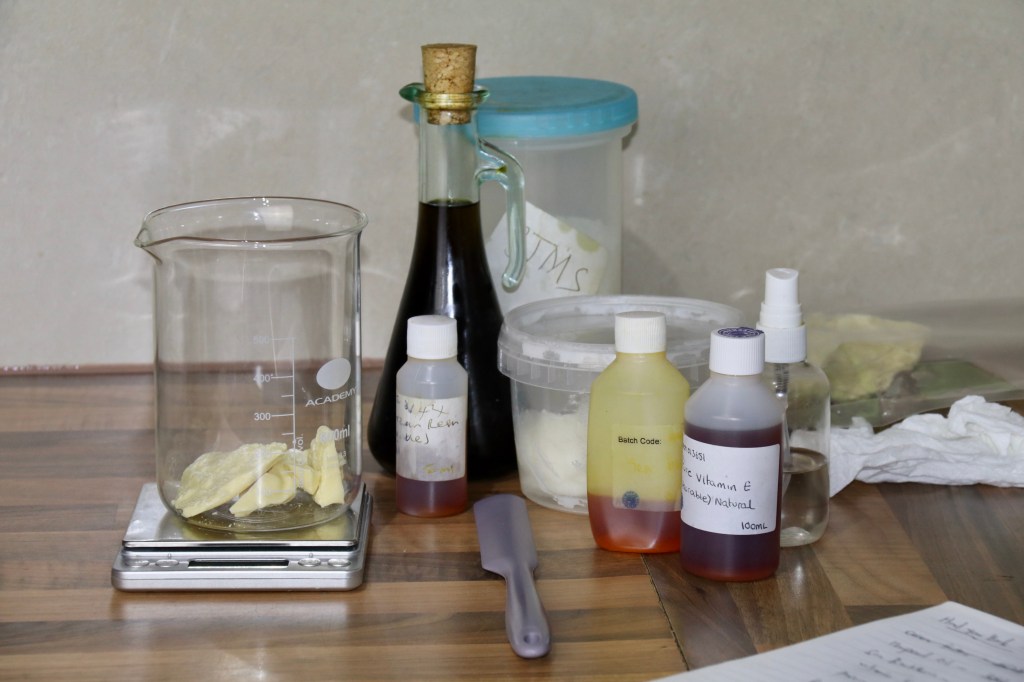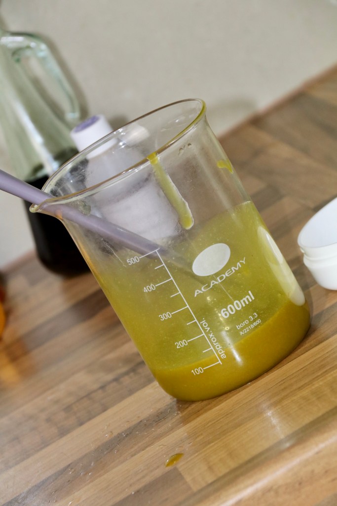 - When your blend is opaque and thicker, pour into a sanitised jar and label if you want to. The reason why you need to keep mixing with a spatula until its opaque is because it makes for a very smooth balm.
