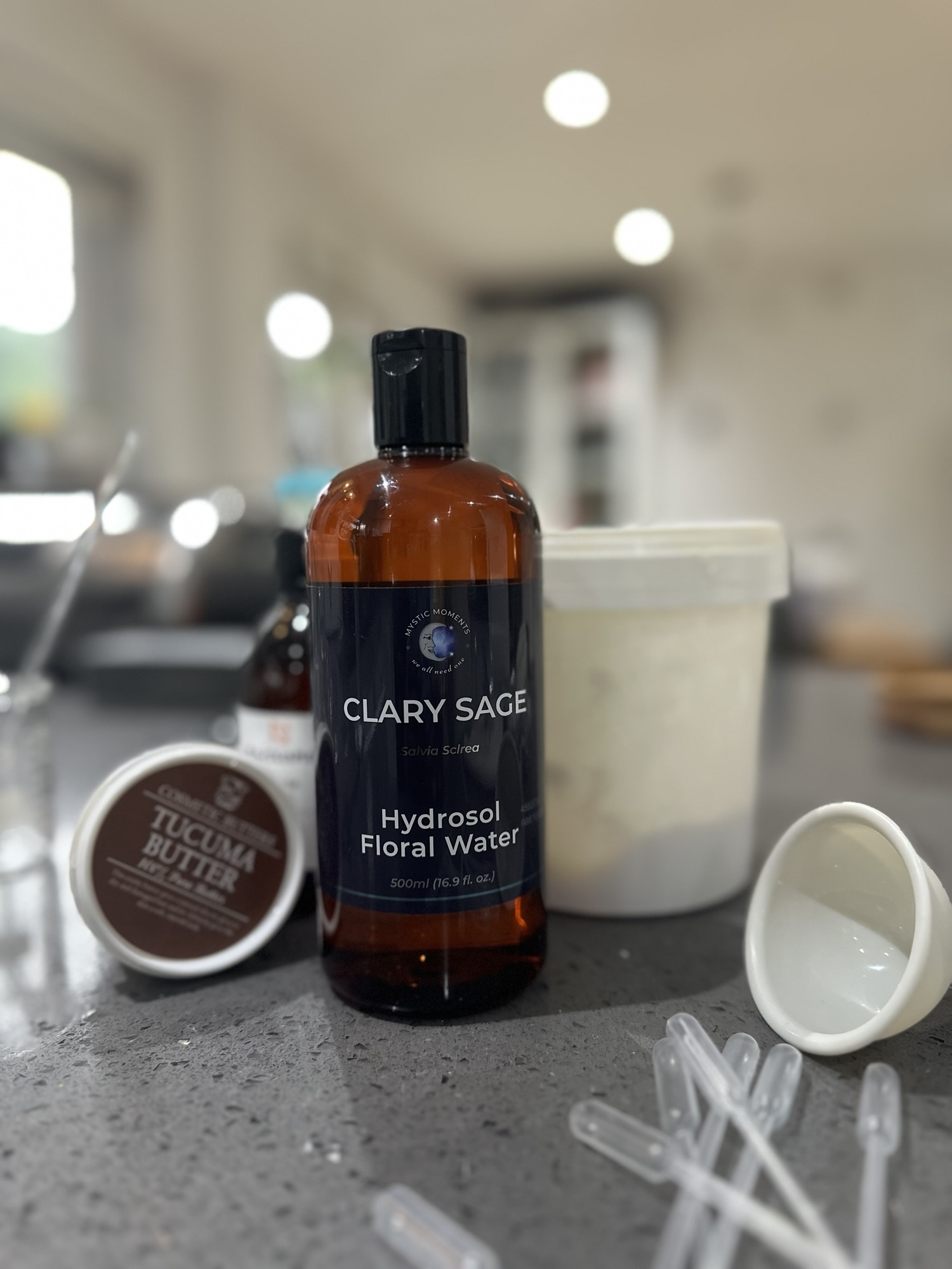 Because this is an emulsion, I craved a simple yet effective and cohesive recipe. An intentional recipe that caters for the scalp and strands. Hence my pick of clary sage hydrosol is the bulk of my water phase.