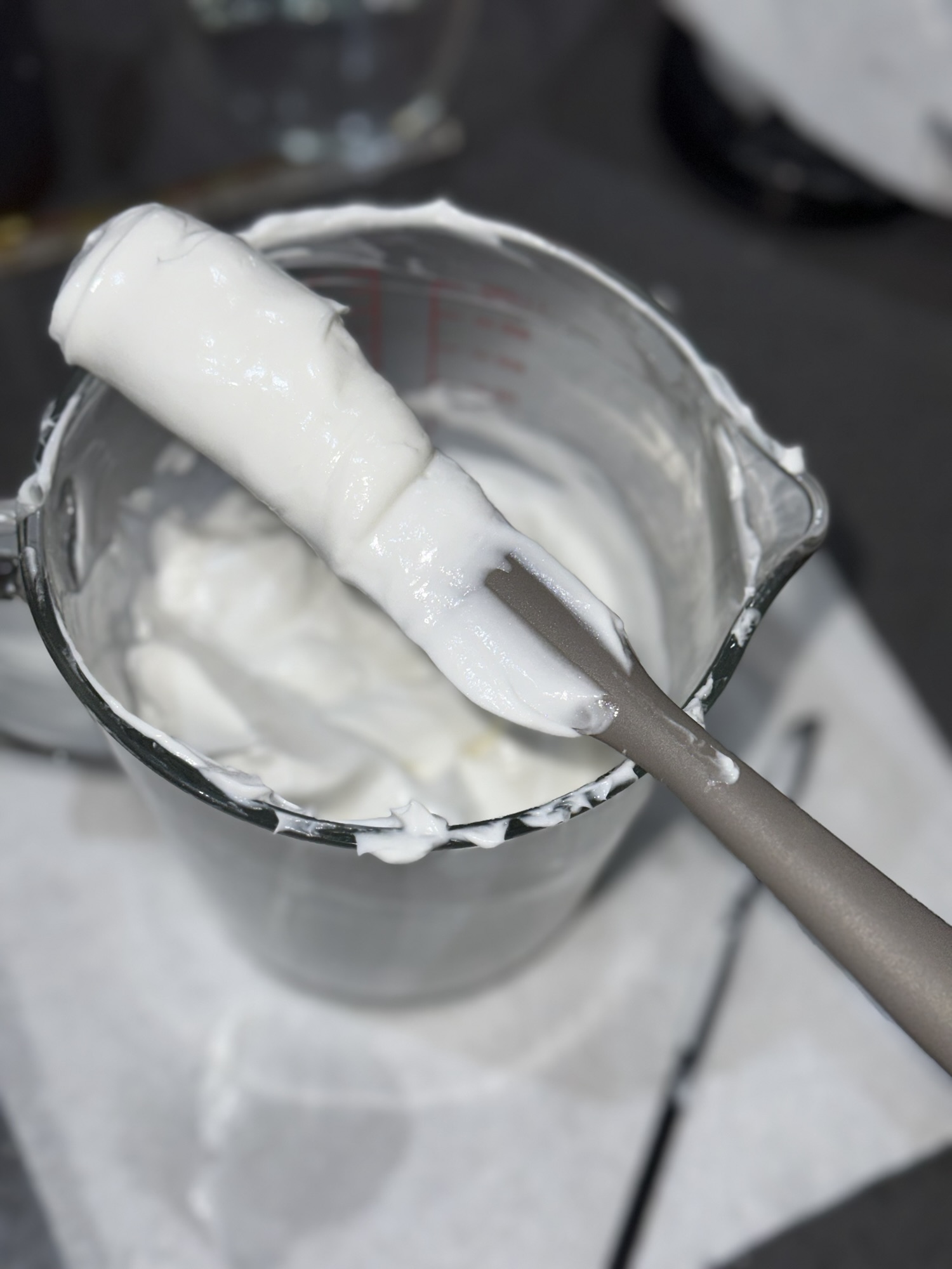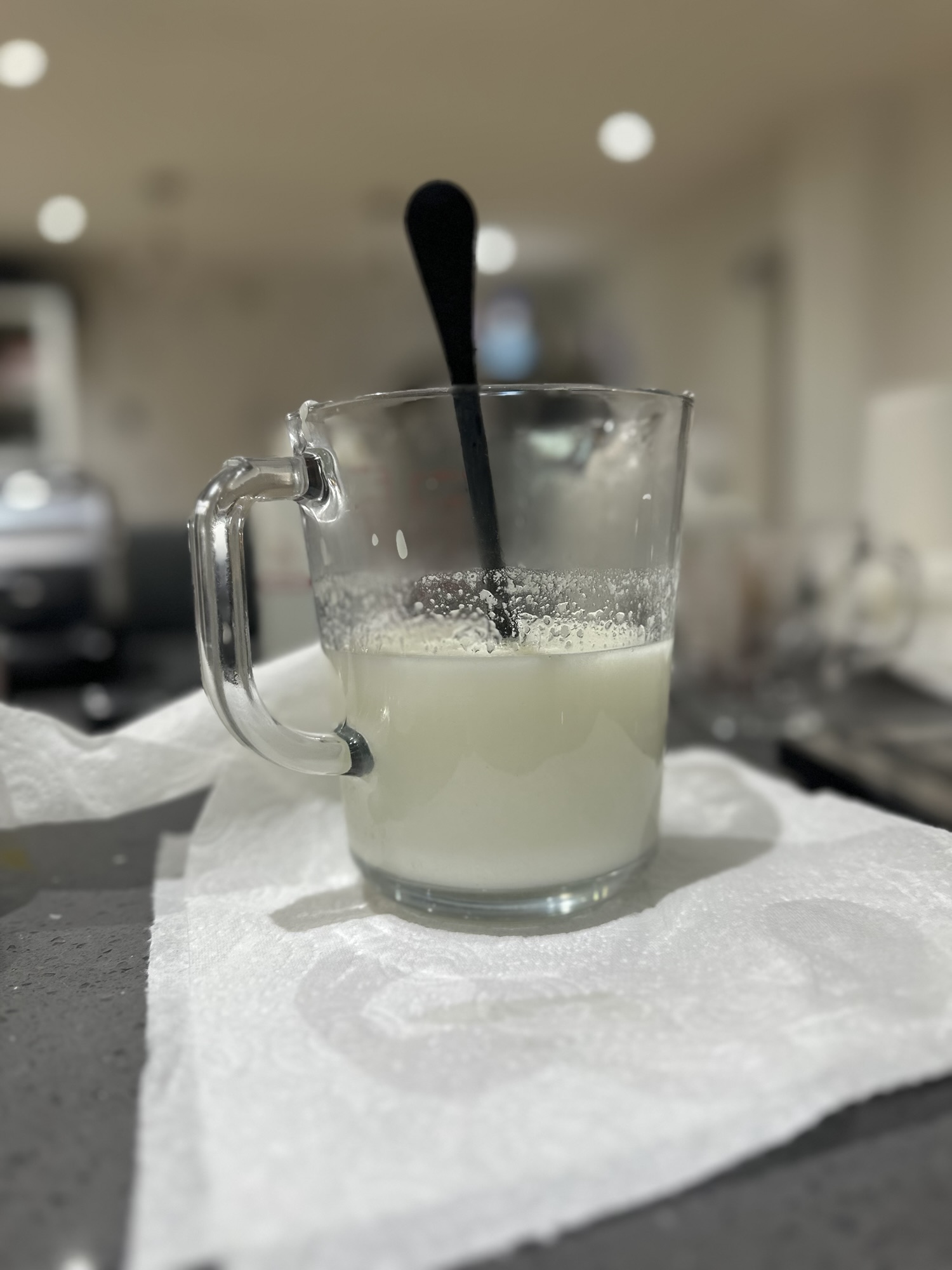 Take your clean and sanitized immersion blender, gently place it in the milky solution and blend thoroughly until you can visibly see a change in viscosity.