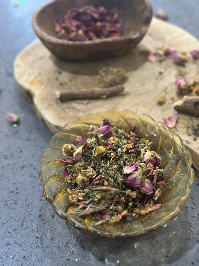 In a clean bowl, measure and mix all herbs and flowers. Because I had re usable tea bags on hand, I added some herb powder in my blend.