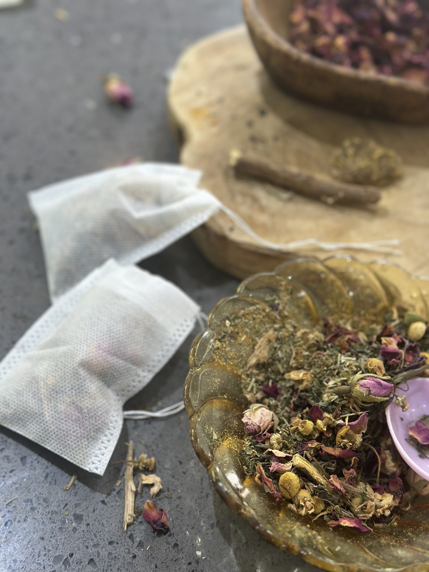 In a clean bowl, measure and mix all herbs and flowers. Because I had re usable tea bags on hand, I added some herb powder in my blend.